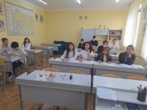 Учитель биологии, Марьям Ахмедовна, наблюдает вместе с детьми, как происходит деструкция яичного белка. В него добавили немного спирта, после которого изменилась природная структура белковой молекулы и превратилась в белые хлопья.
