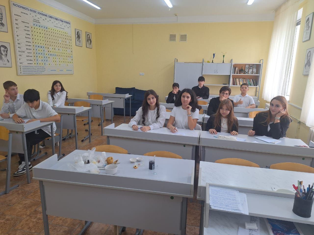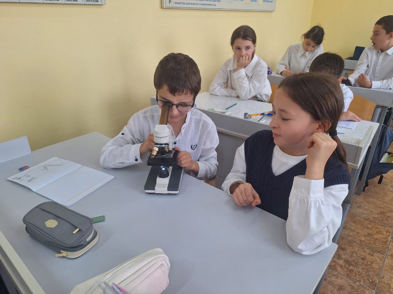 Учитель биологии, Марьям Ахмедовна, наблюдает вместе с детьми, как происходит деструкция яичного белка. В него добавили немного спирта, после которого изменилась природная структура белковой молекулы и превратилась в белые хлопья.