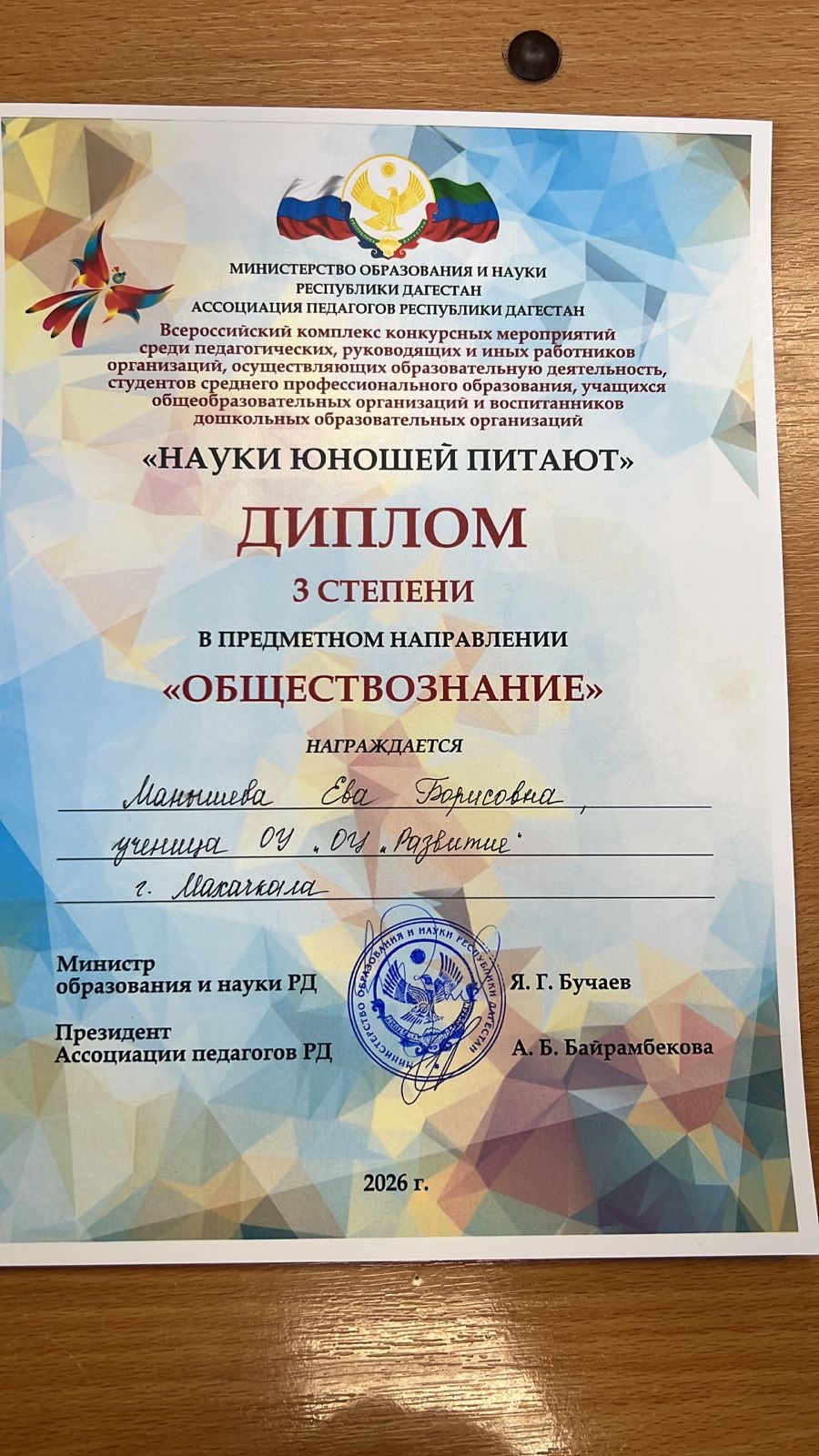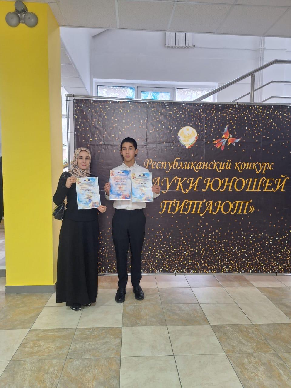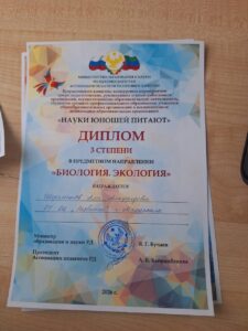 Учащиеся нашей школы, Манышева Ева и Шереметов Али, участвовавшие во Всероссийском конкурсе «Науки юношей питают», стали обладателями диплома 3 степени по таким направлениям, как биология и обществознание.